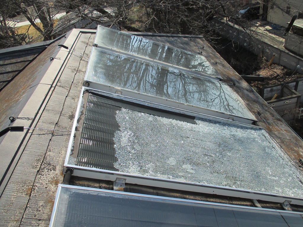 屋根に載っている温水ソーラーパネルの1枚が割れてしまっています。