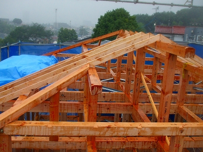 午後 16:30 の様子 ↓ 屋根垂木を始めて本日は終了、午後は雨の中の作業でした。