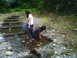 娘たちのつかみ取り用に5匹を浅い囲いへ入れてもらいました